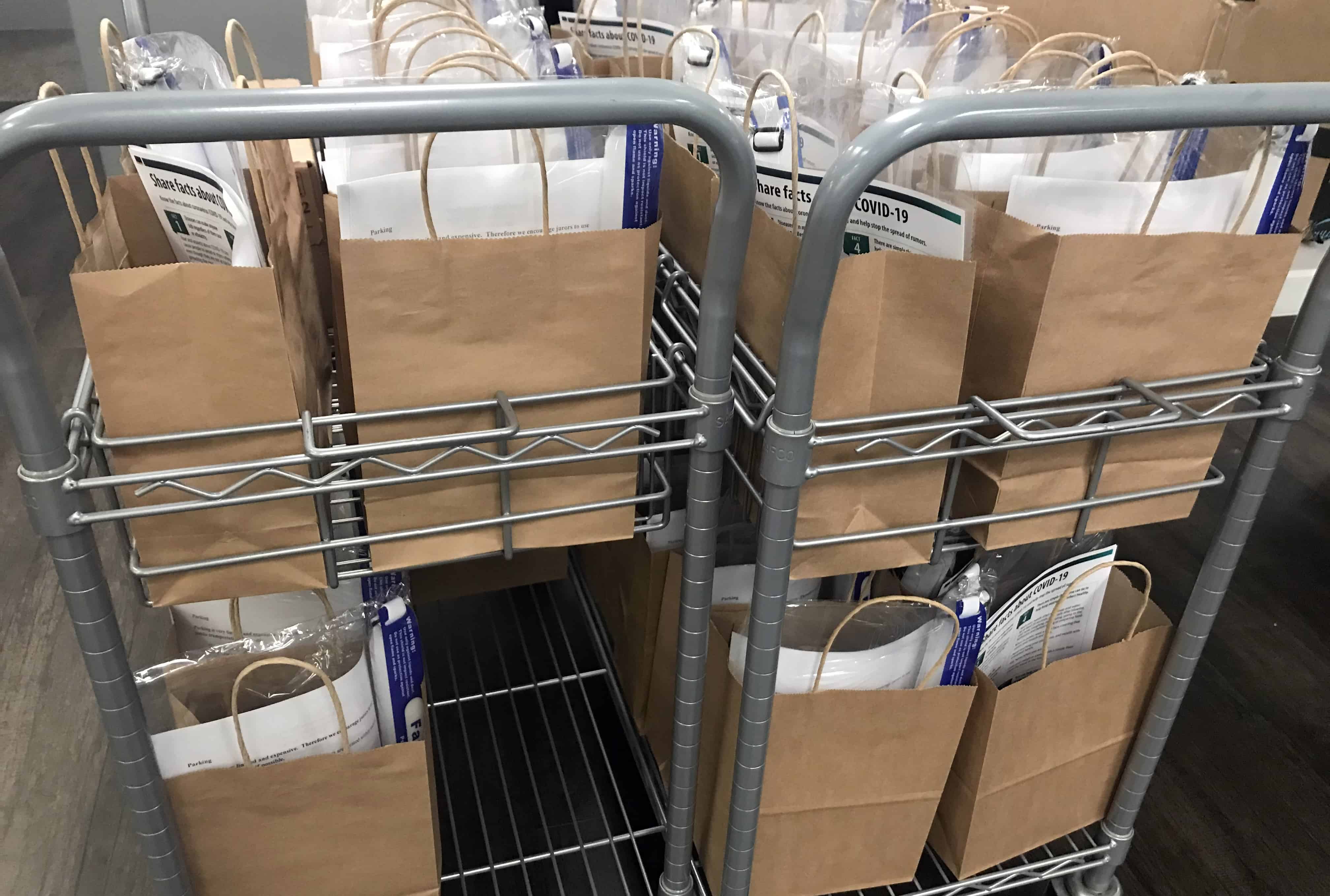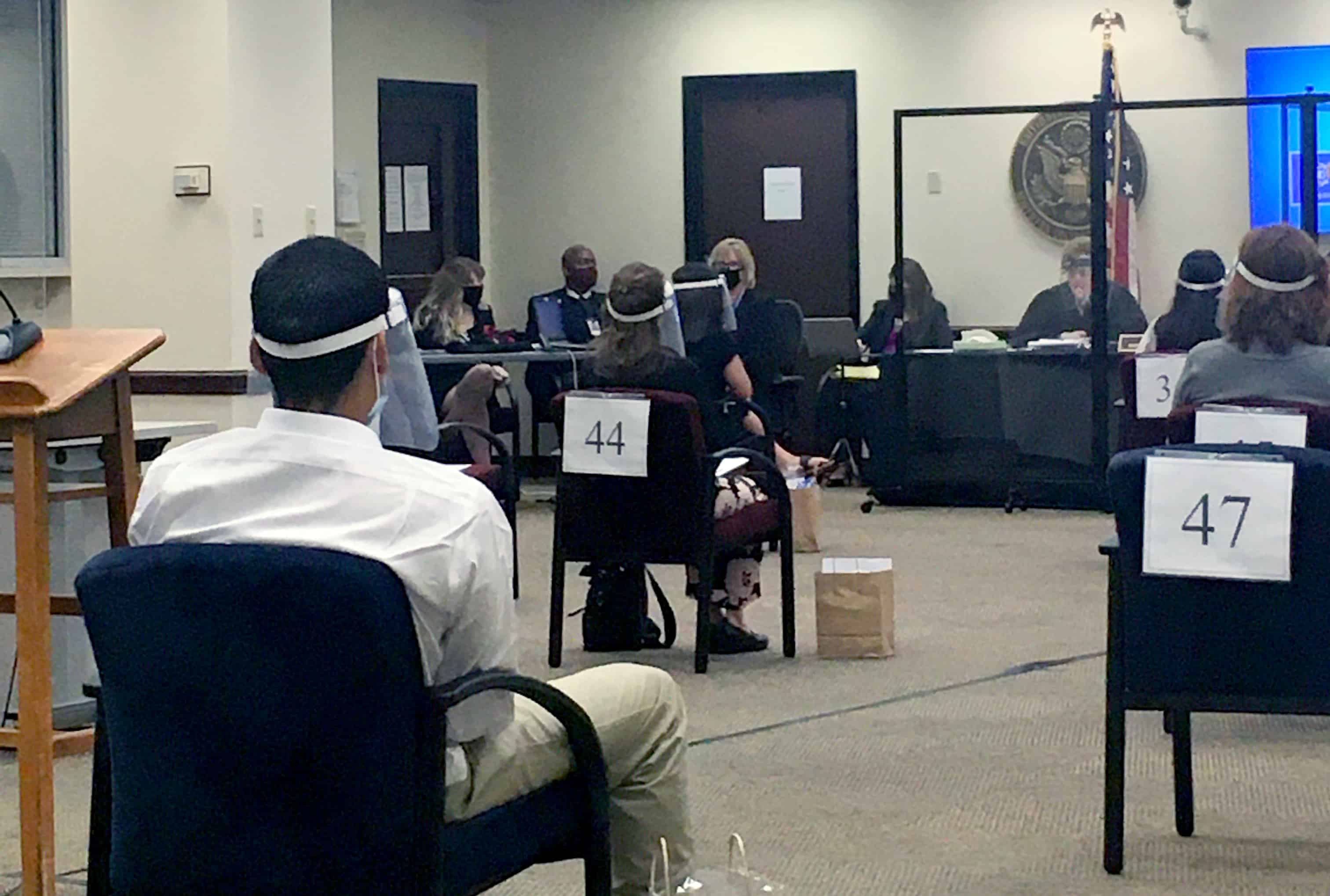 During jury selection, groups of only 16 people were interviewed by the attorneys at a time. They were assigned numbered seats six feet apart, and each person received a kit with a face shield, cleaning supplies, a water bottle, a disposable badge, and instructions for social distancing.