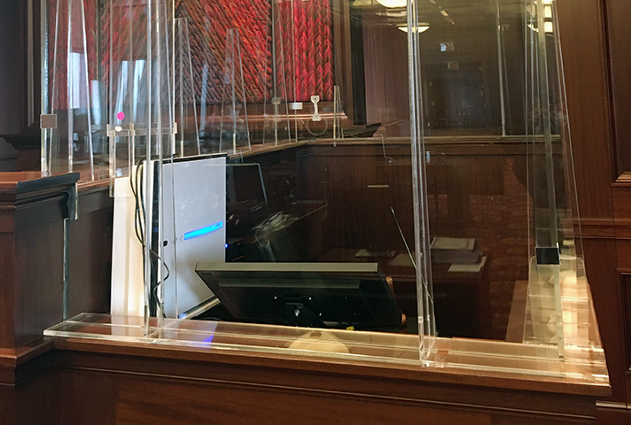 Court visitors and staff must authenticate their health and pass in front of a non-contact digital thermometer before entering the courthouse. Lawyers and their clients use two-way communication devices to avoid whispering to each other in court. Jury boxes and jury deliberation rooms have been expanded, and strict mask requirements are in place.