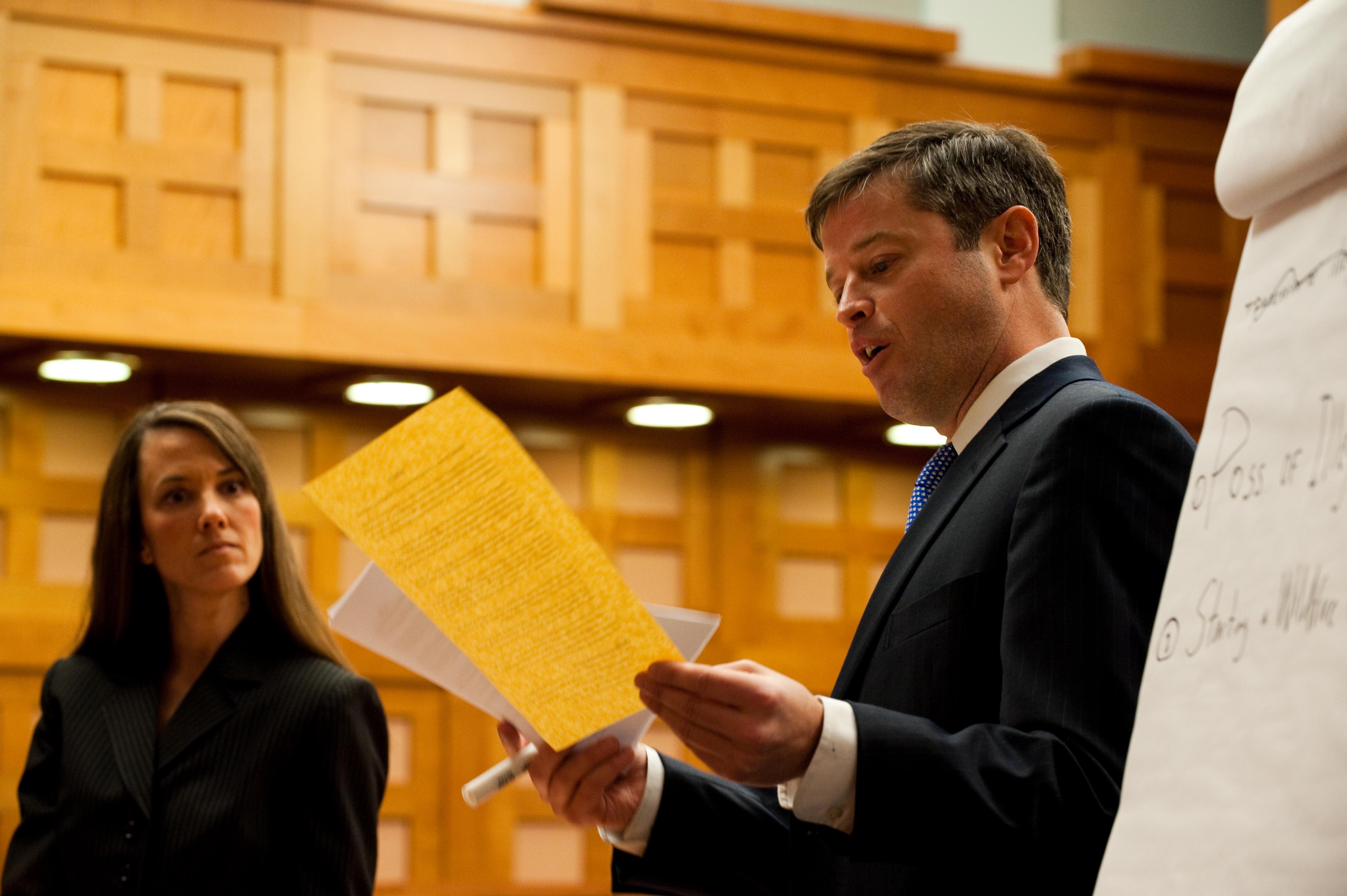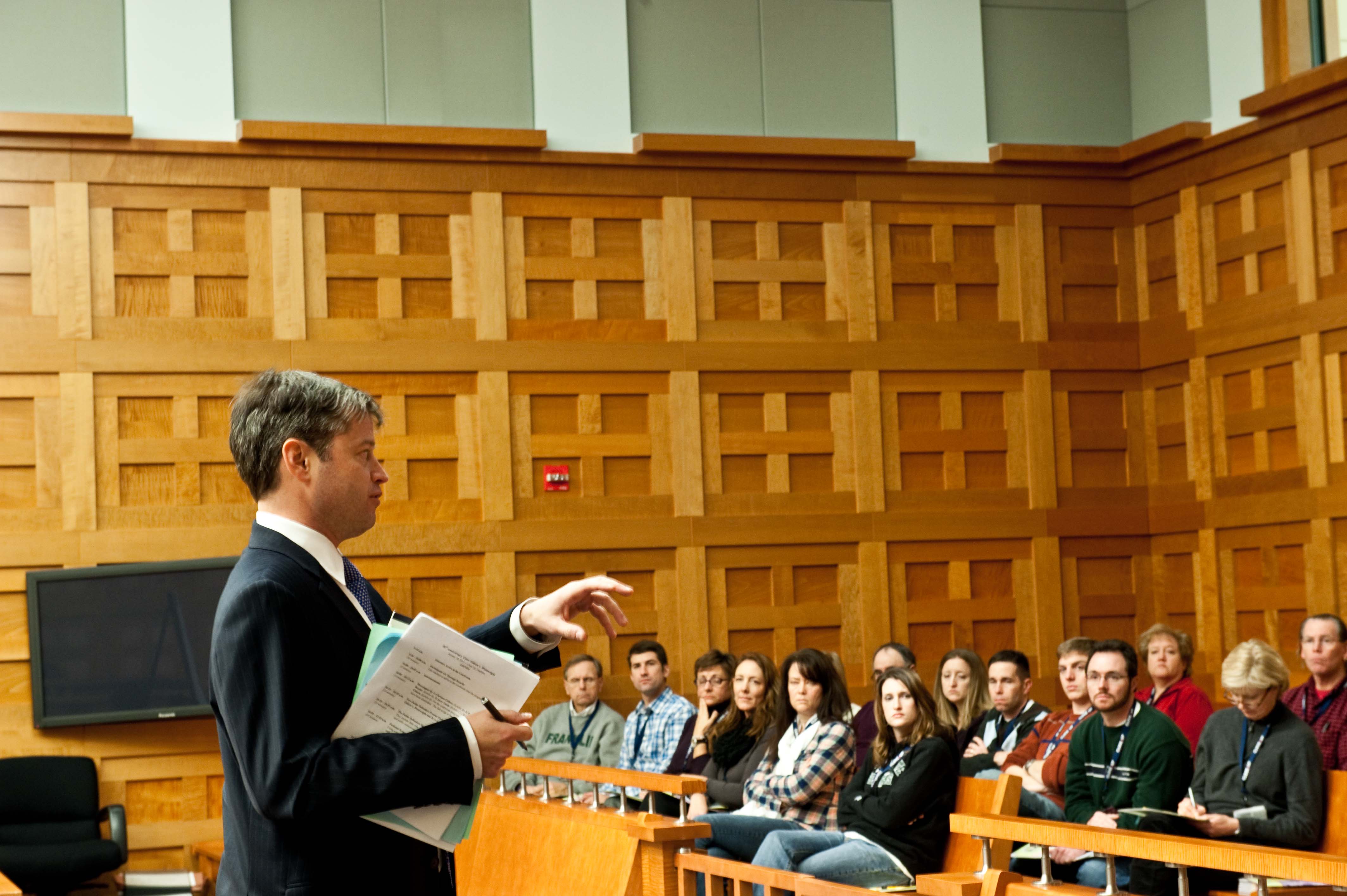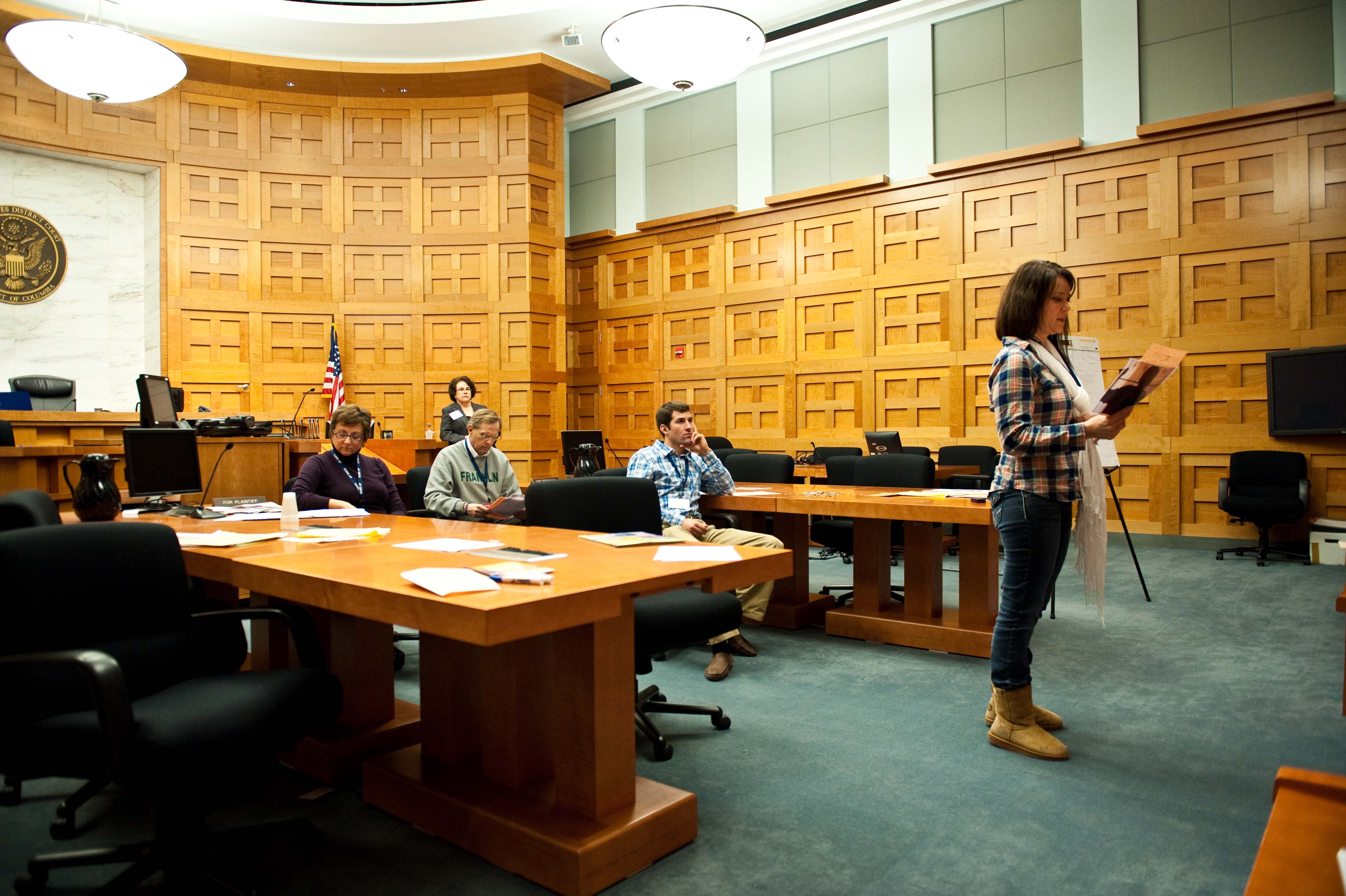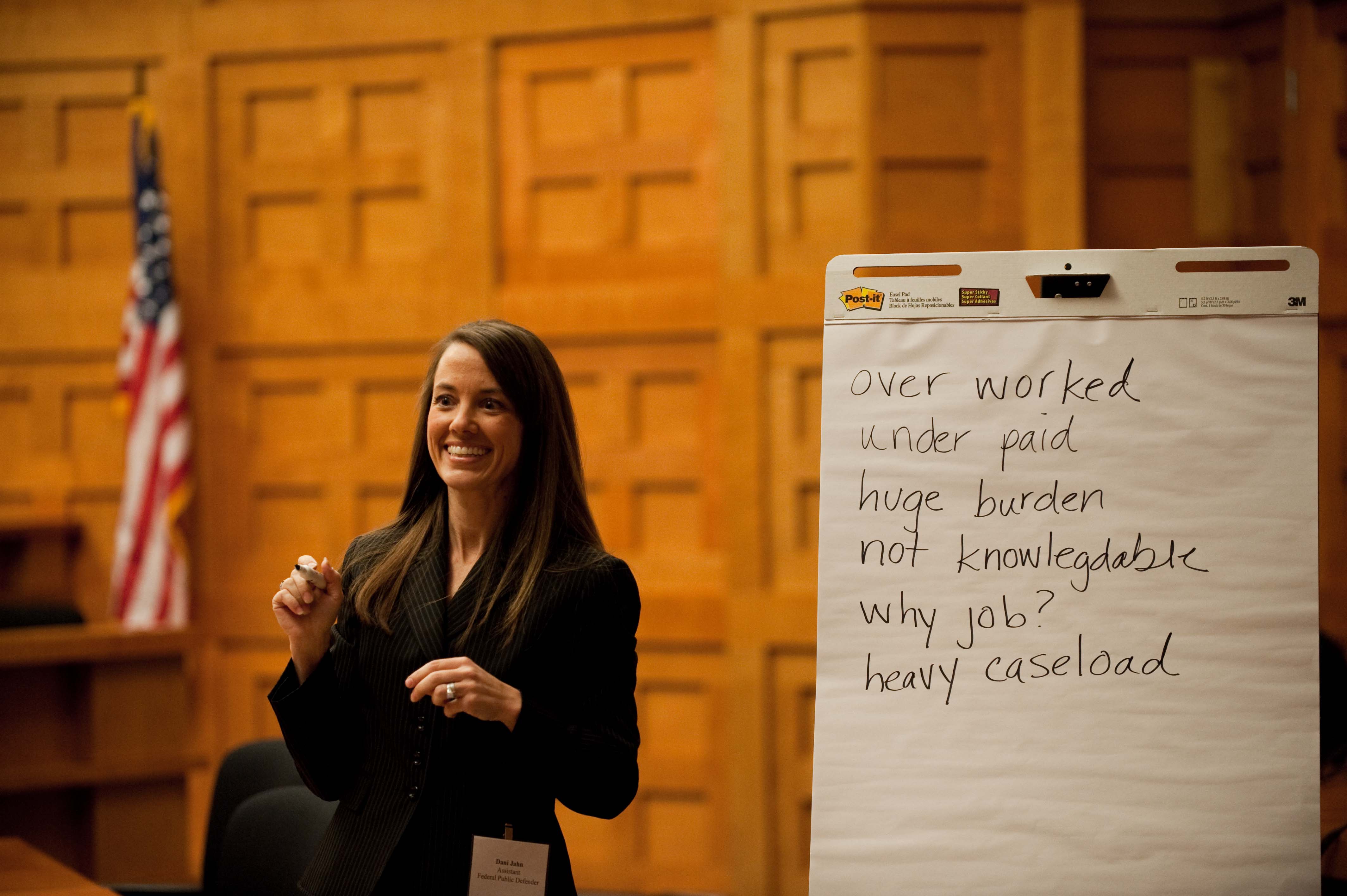 Assistant Federal Public Defenders Dani Jahn and Jonathan Jeffress discuss the importance of the Supreme Court's landmark decision in Gideon v. Wainwright with a group of school teachers.