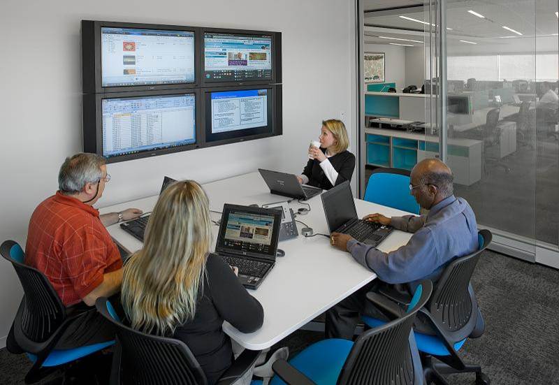 Using a cellphone and a laptop or tablet as a kind of mobile “desk,” employees can take their work throughout an IWI office. Workers might temporarily reserve a glass-enclosed “huddle room” for a small meeting, or a private phone room to join a conference call or do work that requires quiet concentration. They can sit in an open work lounge to catch up on emails, or use a “touchdown” work station to park their computer and write a report.