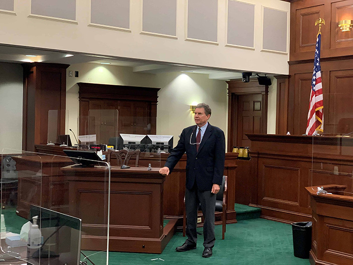 The Southern District of Ohio has enough courtrooms to conduct eight jury trials simultaneously—three each in its Cincinnati and Columbus courthouses and two more in Dayton. In addition to outfitting each juror’s chair with plexiglass, the court gives each juror a sealed plastic bag that contains a mask, gloves, hand sanitizer, writing pad and pen. The court has sufficient space to put the public in overflow courtrooms if needed, and to allow jurors to maintain social distancing.